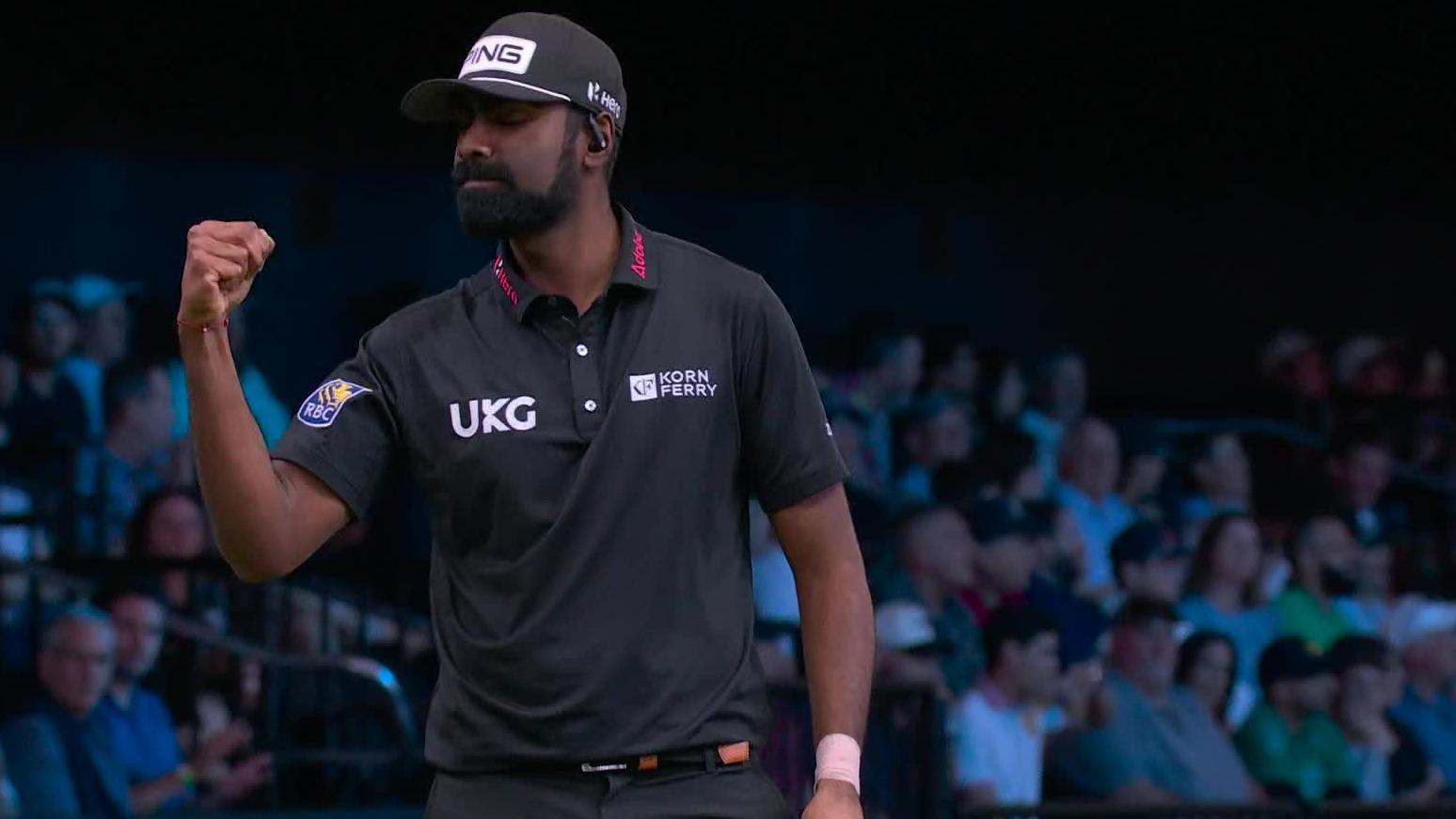 Sahith Theegala drains his putt for birdie on the sixth hole as Los Angeles Golf Club ties the score.