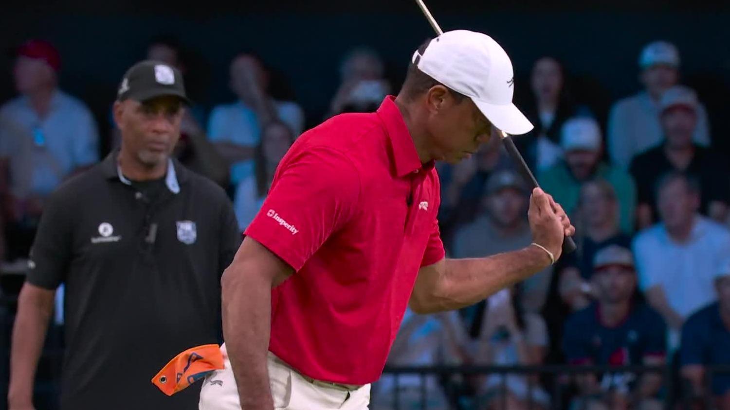 Tiger Woods' putt to tie the seventh hole lips out, leading to Los Angeles Golf Club taking the lead.