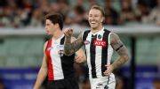 Magpies veteran Scott Pendlebury goes with the no-look assist to Beau McCreery for a Collingwood goal in their opening round clash against St Kilda.