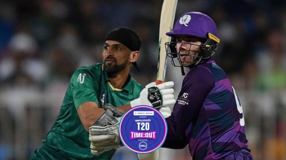 - BATSMENRBM4s6sSR10.1 he's gone first ball after drinks. Given some air outside off, he makes room to crash it through off but skewers it off the outside edge to short third man 41/35.3 cleans him up - Hasan has his first! Real battle for Coetzer, this innings, just 9 off 16 balls, and you sensed something had to give. Went for the slog over the top again, while Hasan's slower ball was arrowing into off-stump 23/17.6 smashed down the ground, and Imad effects a run-out at the non-striker's end. That's unfortunate for the Scots, but Cross had wandered down the crease slightly, and when the drive was clattered back, Imad made sure to get a hand to it on its way through. 36/210.3 castled. Nice loop on the ball, drifting into him and dipping, he's looking to whip it through midwicket, but is beaten by the googly, and the ball thuds into stumps off his pads 41/415.4 stumps shattered. They've been backing away to make room against Shaheen's full, fast ones, but this one is a bit too quick, and he's late on the attempted thrash through off, by which time the stumps have been re-arranged by a Shaheen special. 87/519.2 length ball at normal pace outside off, and he's had a thrash at it, but only manages an under-edge that is dragged back onto the stumps. 114/6Extras12 (b 1, lb 1, nb 3, w 7)TOTAL117/6 (20 Overs, RR: 5.85)Fall of wickets: 1-23 (Kyle Coetzer, 5.3 ov), 2-36 (Matthew Cross, 7.6 ov), 3-41 (George Munsey, 10.1 ov), 4-41 (Dylan Budge, 10.3 ov), 5-87 (Michael Leask, 15.4 ov), 6-114 (Chris Greaves, 19.2 ov)