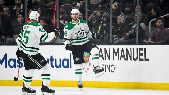 Jamie Benn scores a goal from the side of the net to tie the game in the second period. Less than a minute later, Blake Comeau scores the go-ahead as the Stars win 2-1 over the Kings.