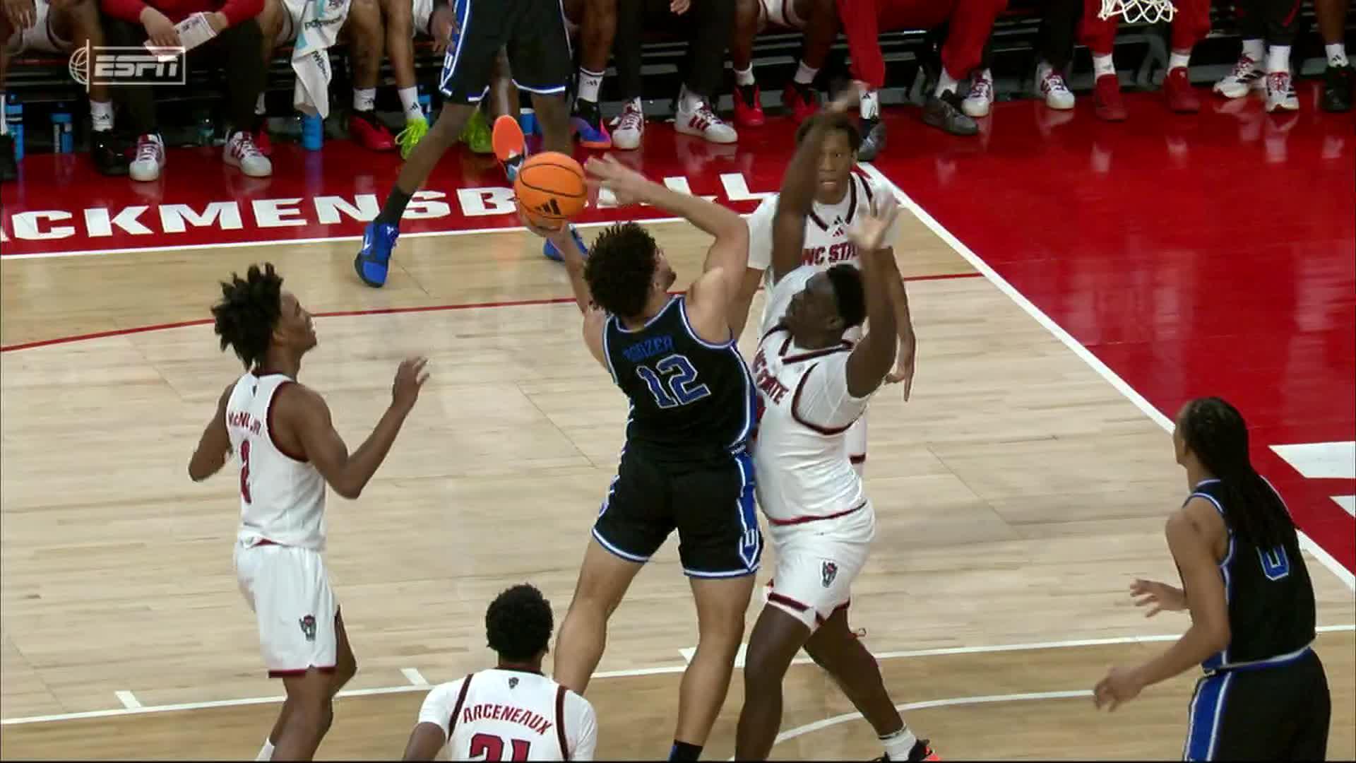 Patrick Ngongba II gets good position in the paint and scores for Duke