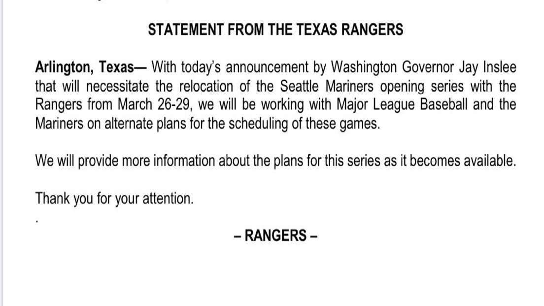 Opening Series (March 26-29) between Rangers and Mariners will be held at an alternative location.