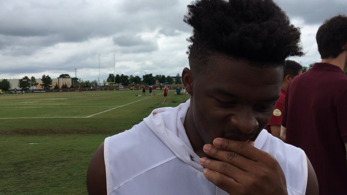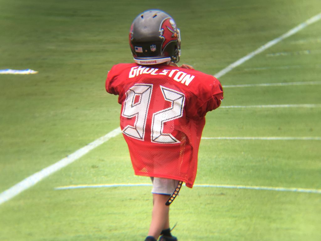 Bucs defensive end William Gholston's son puts on his daddy's pads and helmet while Gholston gets some extra work in after practice.