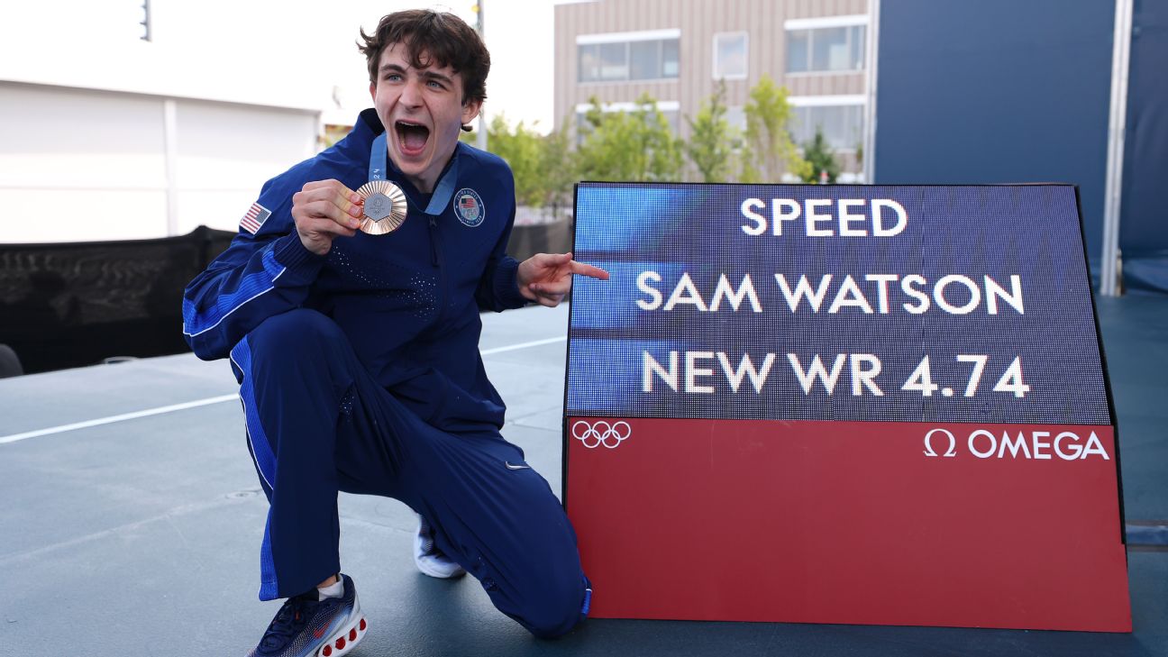 American Sam Watson broke the world record in speed sport climbing, but did so in the bronze medal match after being upset in the semifinals of the Paris Olympics.