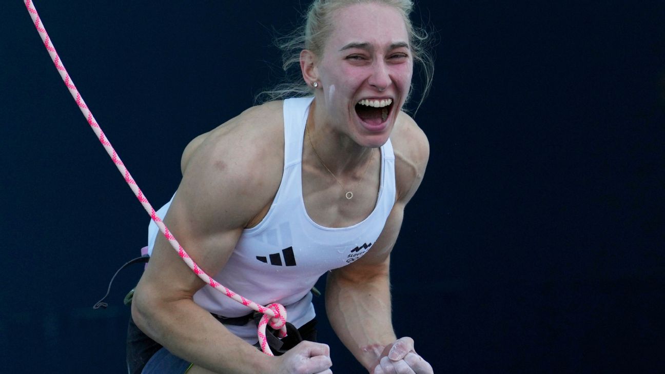 World-record holder Aleksandra Miroslaw of Poland capped her dominant performance at the Paris Games by winning the women's speed climbing gold in a photo finish.